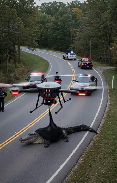 One thing’s for sure — it’s not every day you get stuck in traffic because a prehistoric predator decided to sunbathe on the asphalt.