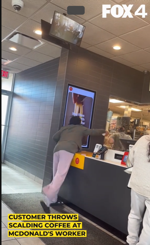 A disturbing video has gone viral showing a McDonald’s customer hurling a cup of hot coffee at an employee during a heated argument at the counter. The incident, reportedly captured inside a U.S. McDonald’s restaurant, shows the woman leaning over the counter before launching the drink directly at the worker’s face, prompting screams and chaos among bystanders.