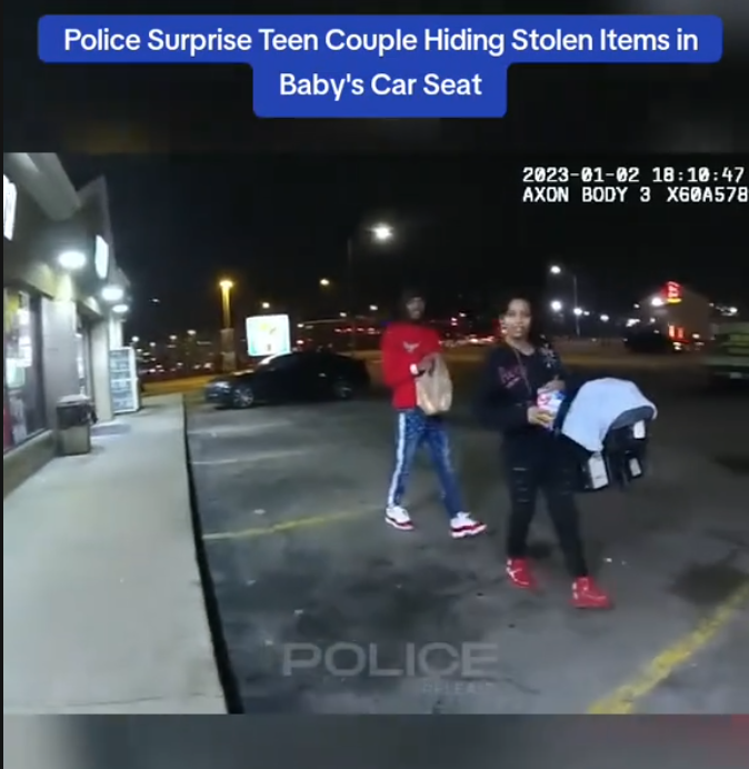 Police bodycam footage has revealed a shocking discovery after officers caught a teenage couple allegedly hiding stolen merchandise inside their baby’s car seat. The incident occurred outside a convenience store late in the evening, where the couple appeared calm and unsuspecting as officers approached.