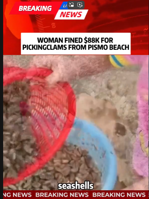 A California woman has been fined a staggering $88,000 after being caught illegally collecting hundreds of clams from Pismo Beach. The incident, which quickly went viral, shows the woman digging through the sand and filling baskets with what she believed were harmless seashells — but were actually live clams protected by local wildlife regulations.