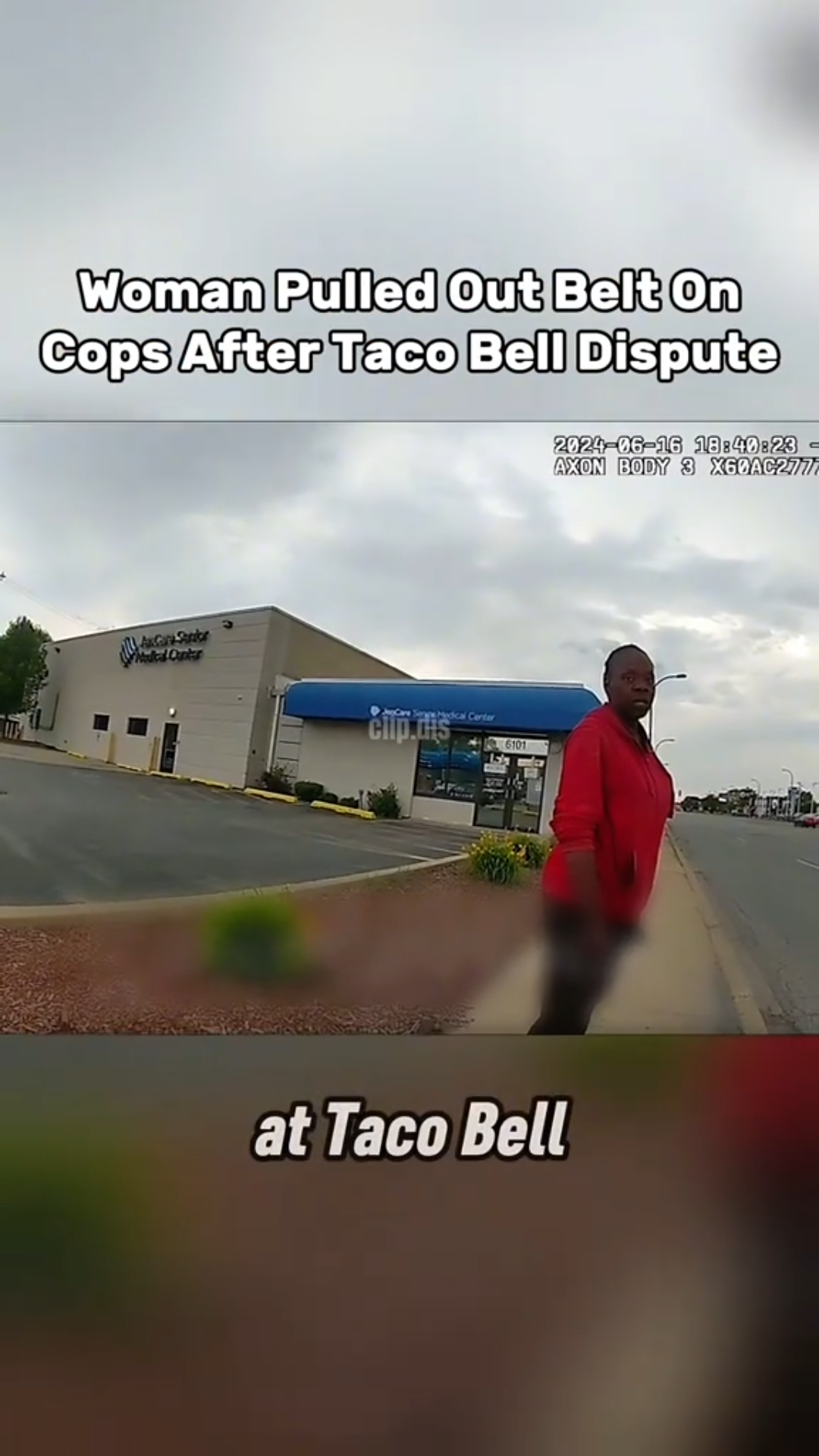 When officers arrived to calm things down, the woman reached into her purse — not for an ID, not for a receipt, but for a belt, which she yanked out with the dramatic flair of a medieval knight unsheathing a sword. The cops freeze. Bystanders freeze. Even the Taco Bell sign looks like it’s reconsidering its life choices.