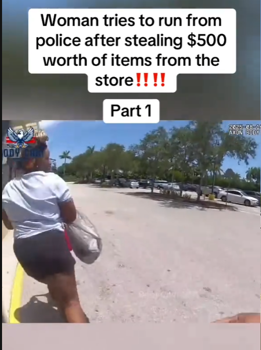 A dramatic police chase unfolded in a store parking lot after a woman allegedly stole roughly $500 worth of merchandise and attempted to outrun officers. Bodycam footage shows the suspect sprinting across the lot with a large bag of unpaid items as an officer yells for her to stop.
